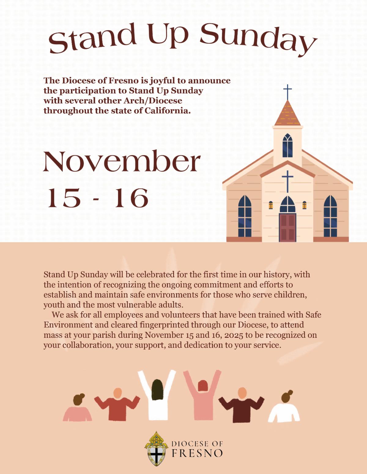 If you have any questions about Stand Up Sunday, please contact Lucia Magana, Safe Environment Coordinator at lmagana@dioceseoffresno.org or (559) 488-2882.