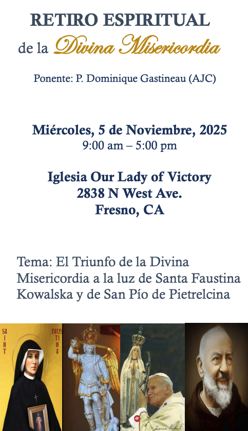 A Divine Mercy Spiritual Retreat will be held in Spanish at Our Lady of Victory in Fresno on Wednesday, November 5th from 9:00am to 5:00pm.