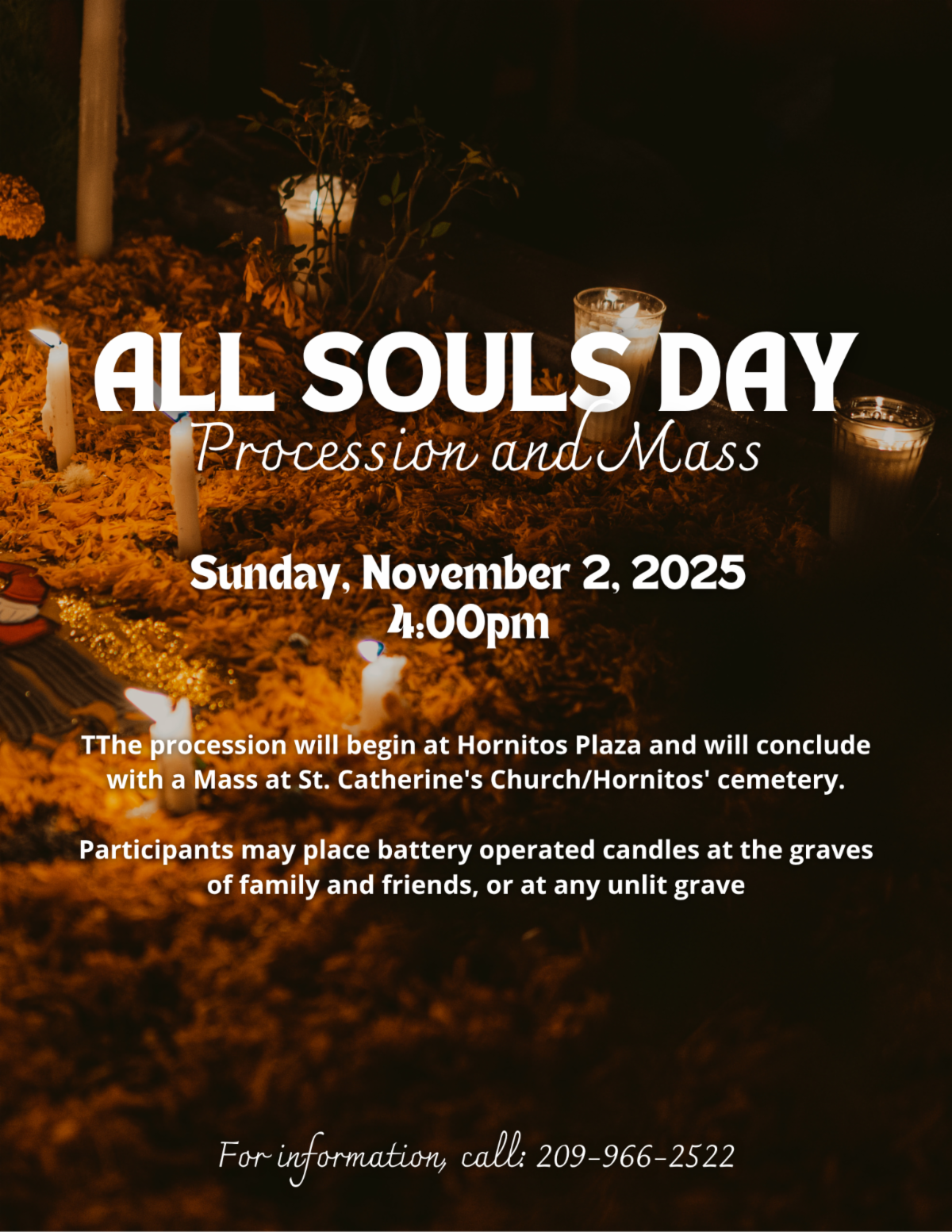The Catholic community of Hornitos invites the faithful to join them for a procession and Mass on All Souls Day, November 2nd, at 4:00pm.