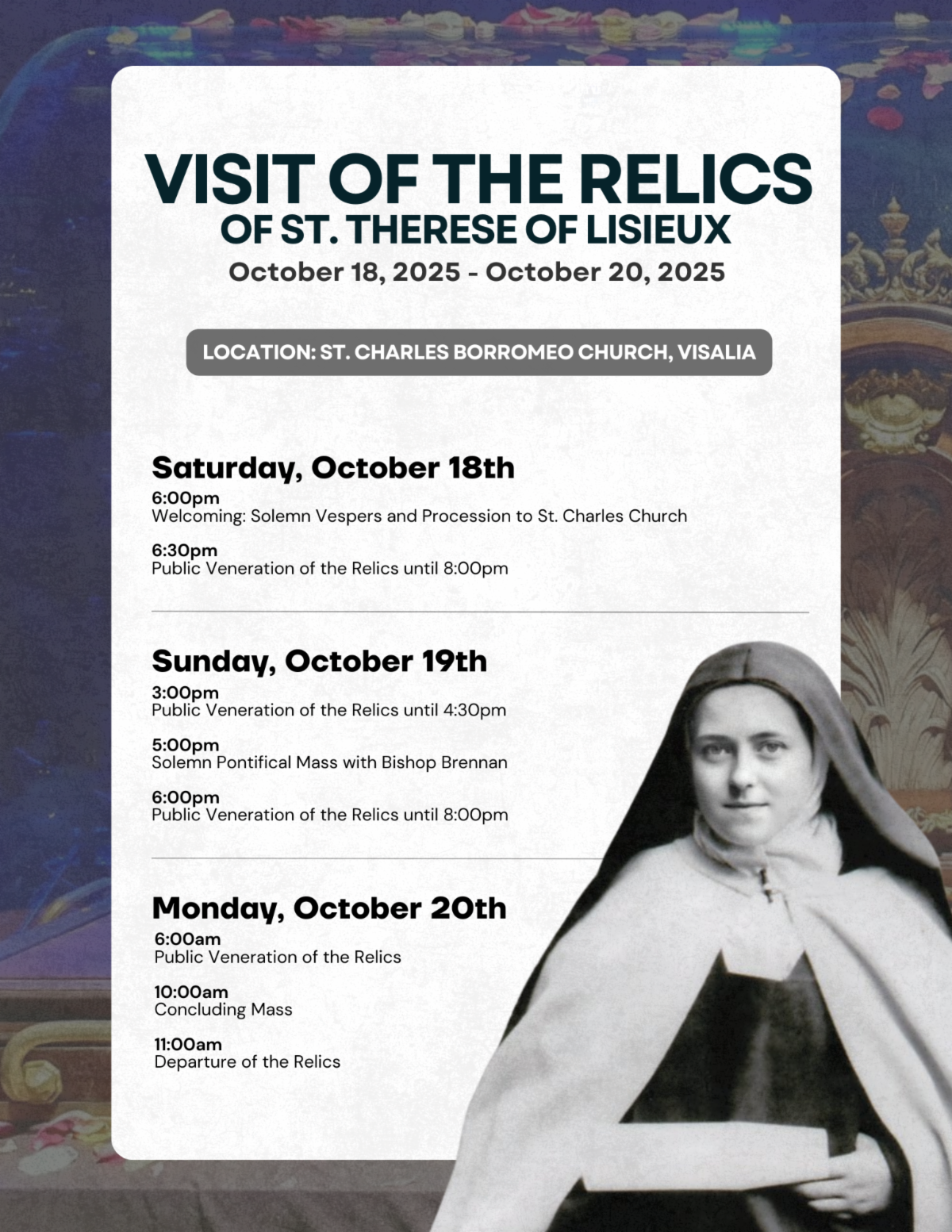 The relics of St. Thérèse of Lisieux are coming to the Diocese of Fresno THIS WEEKEND! From October 18th to the 20th, the relics will be at St. Charles Borromeo Church in Visalia.