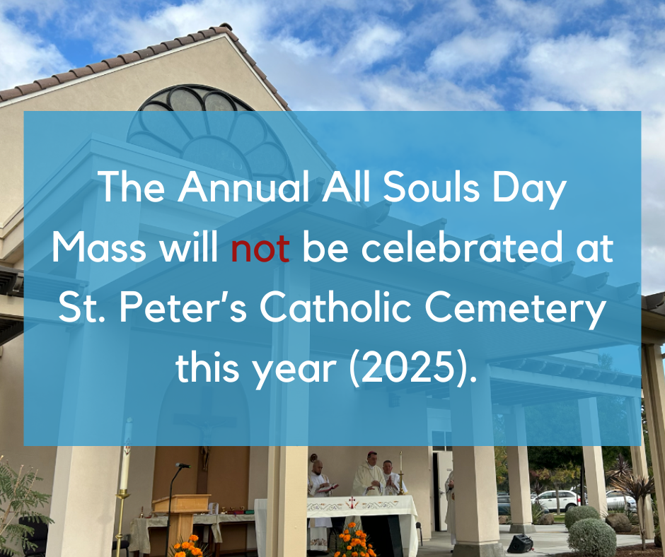 | | Important Information on the Annual All Souls Day Mass | The Annual Outdoor All Souls Day Mass will not be celebrated at St. Peter's Catholic Cemetery this year. We encourage you to attend Mass at your local parish and offer prayers to our beloved brothers and sisters on Sunday, November 2nd. | | |