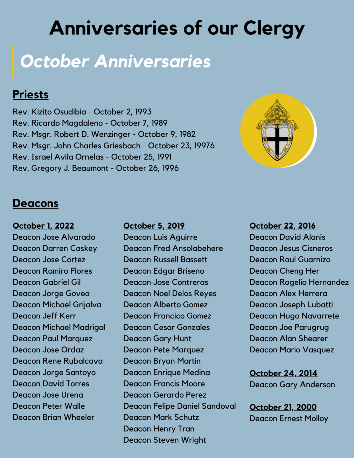 Please note that the Office of Vocation's Monthly Priesthood Discernment Group Meeting scheduled for Sunday, November 2nd at Sacred Heart Church in Bakersfield is cancelled. Men in discernment are encouraged to attend the Holy Hour for Vocations.