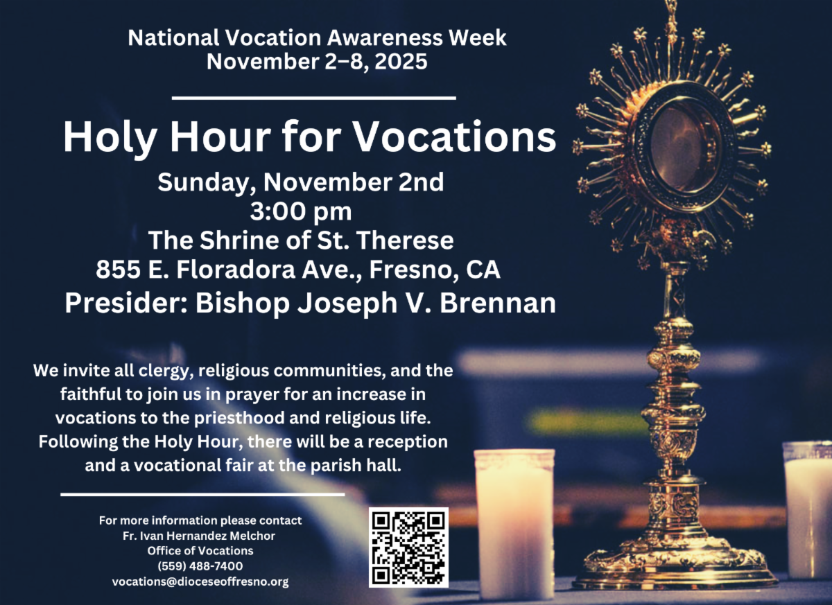 In celebration of National Vocations Awareness Week, the Office of Vocations will be holding a Holy Hour. Join them on Sunday, November 2nd at the Shrine of St. Therese in Fresno starting at 3pm to pray for an increase in vocations to the priesthood and religious life. Following the Holy Hour will be a reception and vocational fair at the parish hall!