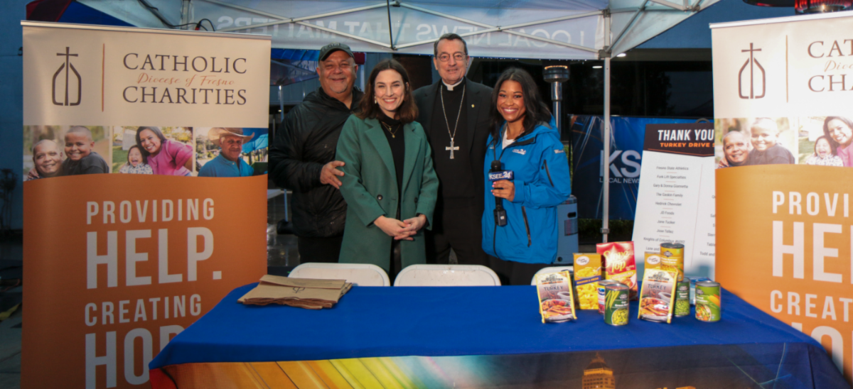 | | | Pictured above from left to right: Jeff Negrete, Executive Director of Catholic Charities, Mackenzie Villalobos, Development Director of Catholic Charities, Bishop Brennan and Taryn Mitchell, KSEE24 Anchor | |