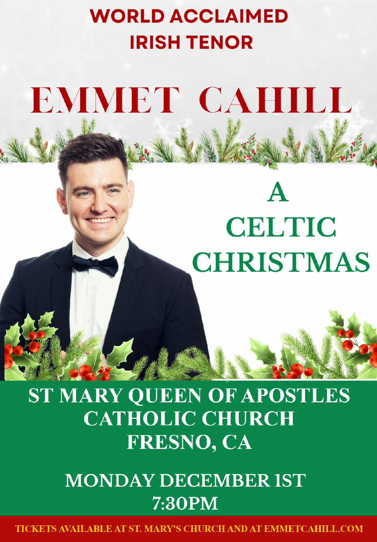 Get your tickets for A Celtic Christmas with Emmet Cahill! The Christmas Concert will be held at St. Mary Queen of Apostles in Fresno on Monday, December 1st starting at 7:30pm.