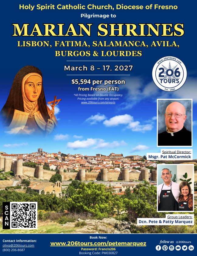 Join Holy Spirit Parish on a pilgrimage to the Marian Shrines in Lisbon, Fatima, Salamanca, Avila, Burgos, and Lourdes from March 8th to March 17th, 2027.