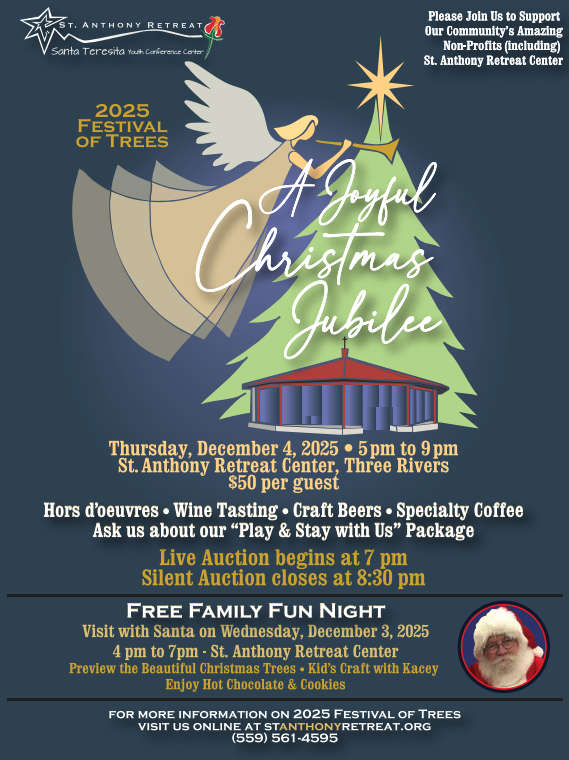 Join the St. Anthony Retreat Center in Three Rivers for their Annual Festival of Trees on Thursday, December 4th. The live auction of Christmas Trees prepared by local non-profit organizations begins at 7pm.