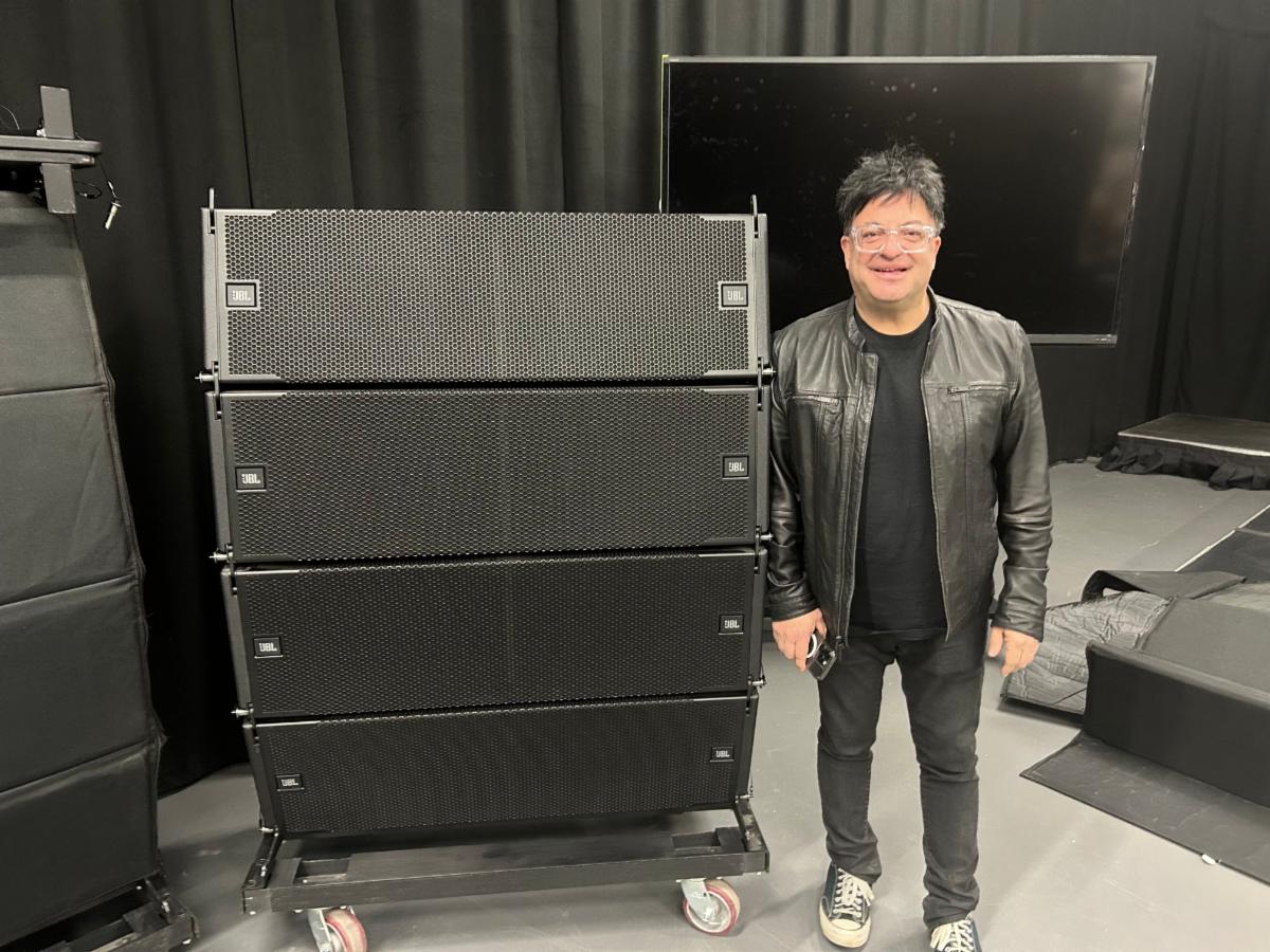 Kelly Kimo, VP Production World, enjoys his favorite spot, standing next to a new array of state-of-the-art speakers that have been added to the audio arsenal.