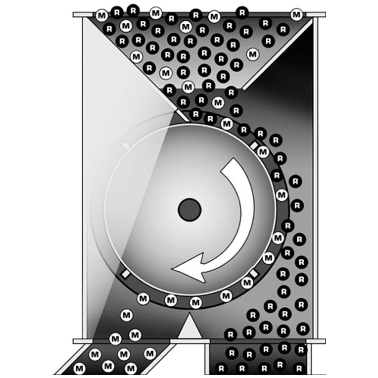 Material enters the top of the magnetic drum separator and flows across the surface of the drum. The drum shell rotates around the stationary magnetic field, capturing any ferrous tramp metal. Unaffected by the magnet, non-ferrous product falls free from the drum into the cleaned material flow. The rotating drum carries the captured metal past the diverter, releasing it outside of the magnetic field. Rotating magnets are often used to overcome bridging of powder over the rods. They generally have a higher efficiency than static drawer magnets.