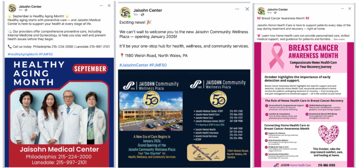 | | JAISOHN COMMUNITY WELLNESS PLAZA UPDATE | In September we kicked off Phase One of construction at the Jaisohn Community Wellness Plaza. We are preparing to relocate our Lansdale Medical Center, Home Health Care, Home Care, and Social Services along with our Central Team by the end of this year and the Senior Community Center by April 2026. | JAISOHN DEPARTMENT UPDATES | | Jaisohn Medical Center & Community Health Worker Program | | |