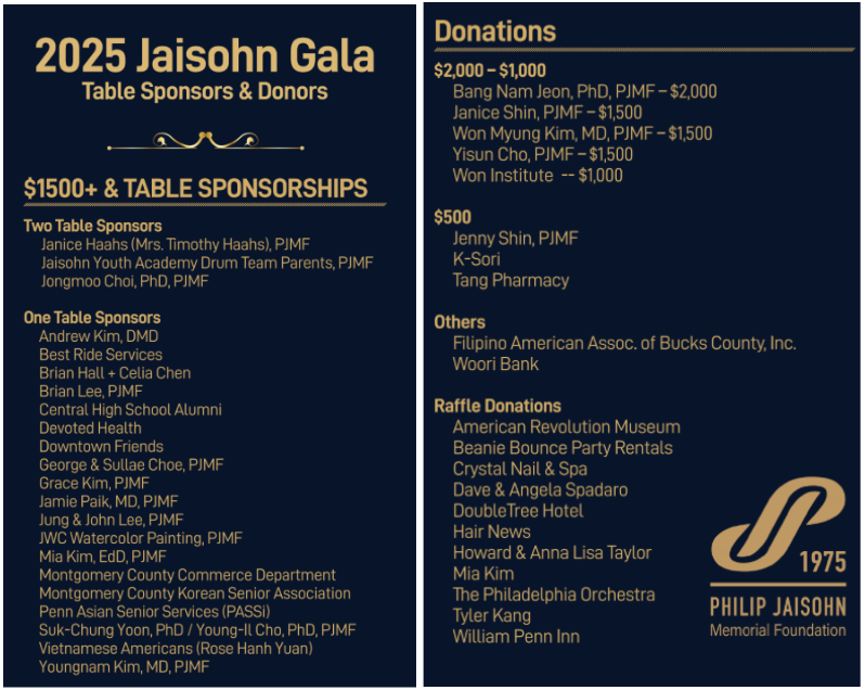 We had the honor of celebrating our 50 years of service to the Philadelphia and Montgomery communities with 500 friends and supporters at the 2025 50th Anniversary Jaisohn Gala on November 8th. We are grateful to everyone who chose to spend the evening with us, and are especially thankful for our special speakers: PA Secretary of Human Services Valerie Arkoosh, PA Secretary of Policy and Planning Akbar Hossain, Senator Art Haywood, Commissioner Neil Makhija, Rep. Steve Malagari, and Matthew Skic, Director of Collections and Exhibitions at the Museum of the American Revolution. That kind of commitment says everything about our supporters in this community and we are so fortunate to have their support in our journey together. Philip Jaisohn Memorial Foundation 50th Anniversary video
