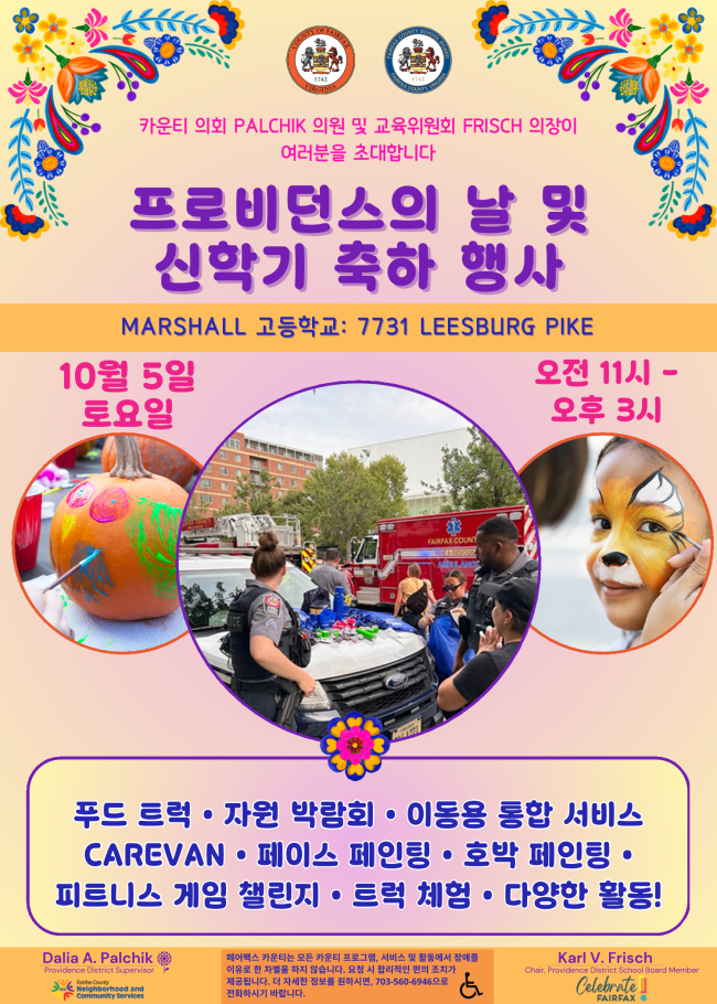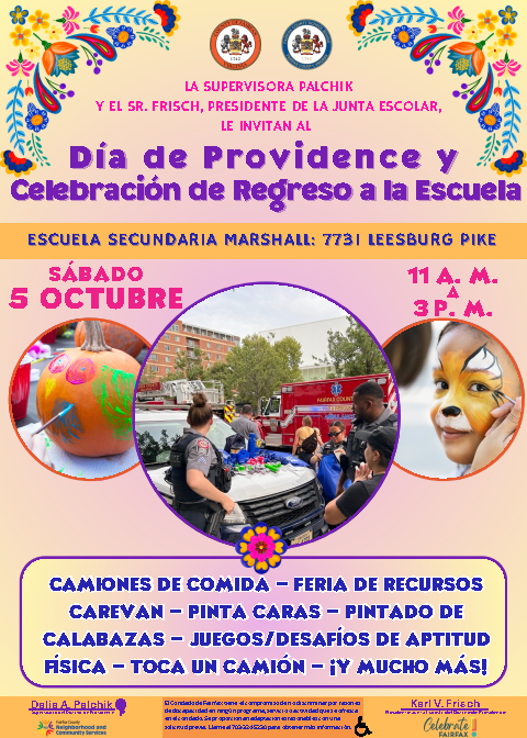 This community event, co-hosted by Chair & Providence District School Board Member Frisch, Celebrate Fairfax, Neighborhood and Community Services, and myself, will highlight local organizations and businesses while fostering stronger connections among residents and community leaders. This FREE, family-friendly event is a wonderful opportunity to meet your neighbors, connect with local organizations, and prepare for a successful school year. Join the fun and welcome the fall season with your friends, family, and community on Saturday, October 5th from 11 am to 3 pm at George C. Marshall High School (7731 Leesburg Pike)!