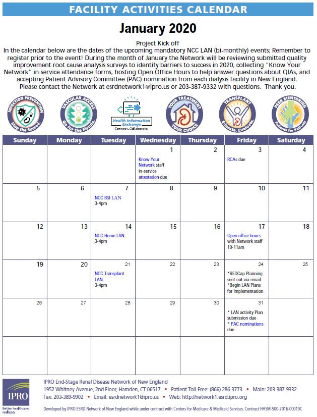 In 2020, there are many national healthcare initiatives being launched to improve the quality of care and quality of life for individuals impacted by End-Stage Renal Disease (ESRD). IPRO ESRD Network of New England, under the Centers for Medicare & Medicaid Services (CMS) Federal Regulations, is mandated to oversee quality improvement activities (QIAs), monitor performance outcomes, address patient experience and access to care concerns, spread best practices, and report intervention barriers to CMS. The initiatives for improving kidney health in 2020 are: