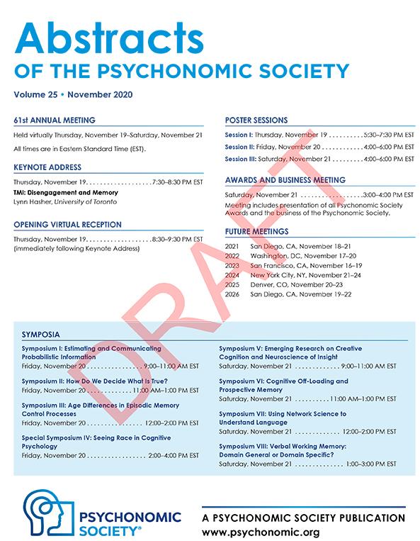 If you need to submit a correction to an author name, affiliation, or author order, or if you have questions about your presentation, please contact Member Services at education@psychonomic.org by October 23, 2020.