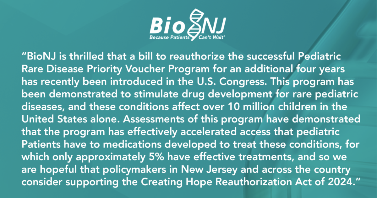 Only an estimated 5% of rare pediatric diseases have an effective treatment, and about 10 million children in the U.S. alone confront these conditions. Given that this program will expire on September 30, BioNJ is hopeful that New Jersey’s congressional delegation will consider supporting this legislation.