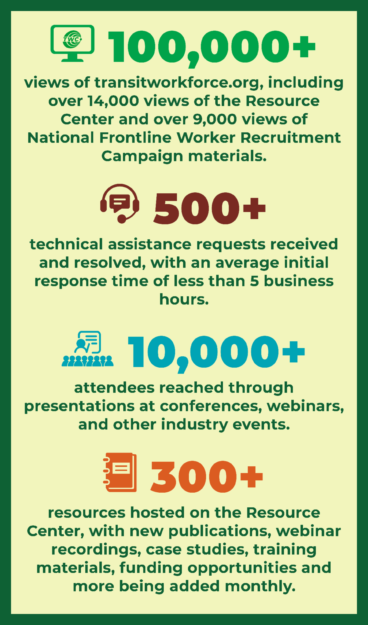 TWC continues to reach numerous transit industry stakeholders through public presentations, website resources, and technical assistance. The TWC team has presented at state and national conferences, hosted and participated in webinars, added extensively to transitworkforce.org, and continued to provide in-depth ongoing engagement to transit locations requesting technical assistance. Since TWC’s inception in September 2021, support to the industry has included: