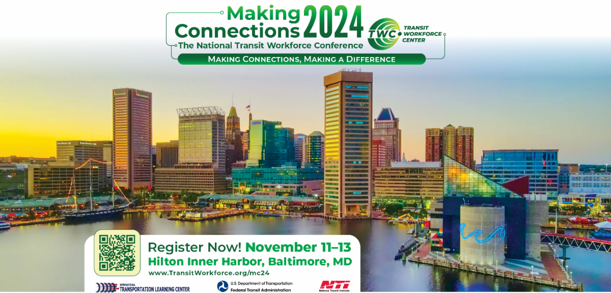 Registration is now open for Making Connections 2024 – The National Transit Workforce Conference (MC24), on November 11-13, 2024 in Baltimore, Maryland's Inner Harbor. Join us to hear from and interact with a diverse range of industry stakeholders, including key representatives from transit agencies of all sizes, labor and the frontline workforce, government, nonprofit, community, education, and workforce development organizations.