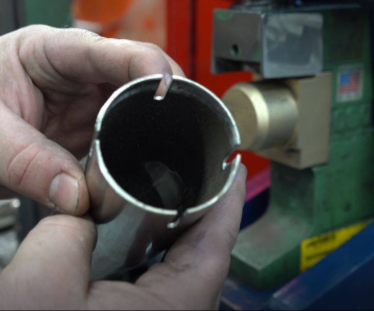 A manufacturer of exhaust systems utilizes UniPunch tooling to punch four slots in the end of tubing. The purpose of the slots is to allow the tube to be assembled into the inside diameter of the muffler.