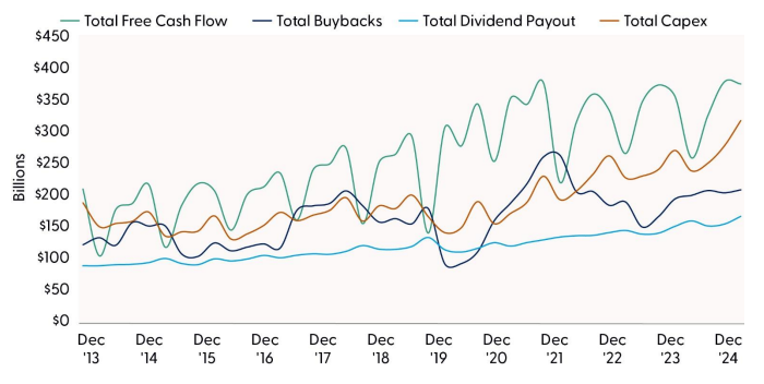 Rising free cash flows among S&P 500 companies should continue to support buybacks this year. However, companies have been spending an increasing amount of their excess cash on capital expenditures (capex). As illustrated in the “S&P 500 Corporate Cash Spending” chart, total buybacks have not kept up with the rise in free cash flows as companies have significantly ramped up capex spending over the last year. A big chunk of that capex spend is being allocated to artificial intelligence (AI) projects, including data center buildouts, processor upgrades, and expanding cloud services. Four of the big hyperscalers alone (AMZN, GOOG/L, META, MSFT) are projected to collectively spend around $333 billion on AI this year, marking a potential 35% increase from last year.
