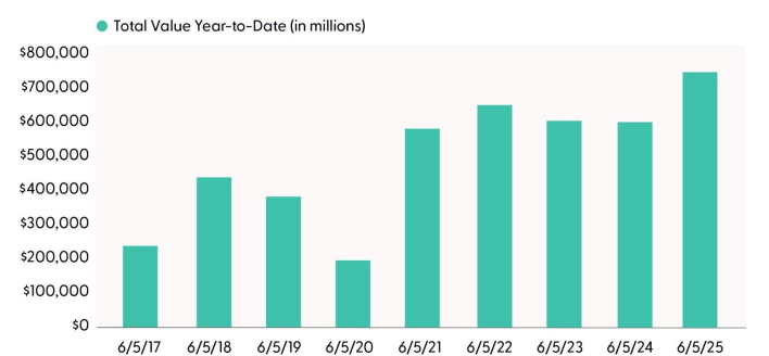 Corporate America has a substantial amount of stock to repurchase, and with only a few companies left to report this quarter, the buyback window is nearly wide open for the S&P 500. In aggregate, announced buyback programs among S&P 500 constituents reached roughly $750 billion year-to-date (as of June 5). As the “S&P 500 Announced Buyback Programs” chart illustrates, this is well ahead of the total authorized repurchase value reached as of early June during prior years. For example, by early June 2023 and 2024, companies had only authorized around $600 billion in buybacks.