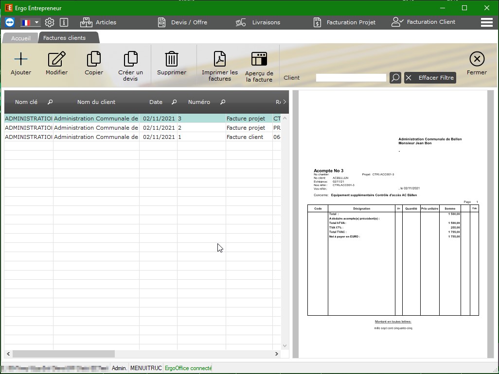 Désormais, vous pouvez visualiser vos factures client qui sont classées dans ErgoOffice sans avoir besoin de les ouvrir, directement depuis ErgoEntrepreneur, simplement en affichant le panneau d'aperçu.