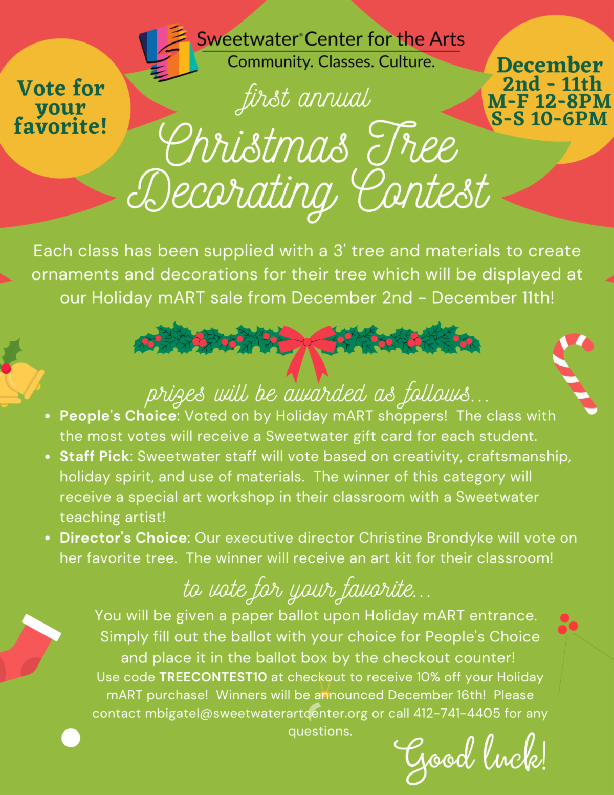Holiday mART is a pop-up shop comprised of dozens of artists who feature a variety of handcrafted items. This year Sweetwater Center for the Arts will offer in-person sales in the Sweetwater Community Room with a beautiful pop-up boutique. The market will feature artists who craft handmade gifts in ceramics, fiber art, wood, metal, paper, glass, and fine art, as well as holiday themed gifts, gifts for children, and edibles.