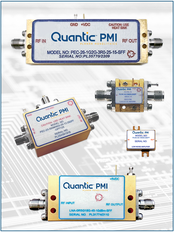 Quantic PMI's Broadband Low Noise Amplifiers (LNA) offer the industry’s lowest noise figure available up to 70 GHz, internal voltage regulation, internal reverse voltage protection, multichannel configurations, 2-IN-1 dual use connectorized or surface mount designs, and unconditional stability. Frequency range, gain and OP1dB values can be optimized to meet your requirements. Form, Fit, and Function designs are our specialty. COTS and RoHS availability.