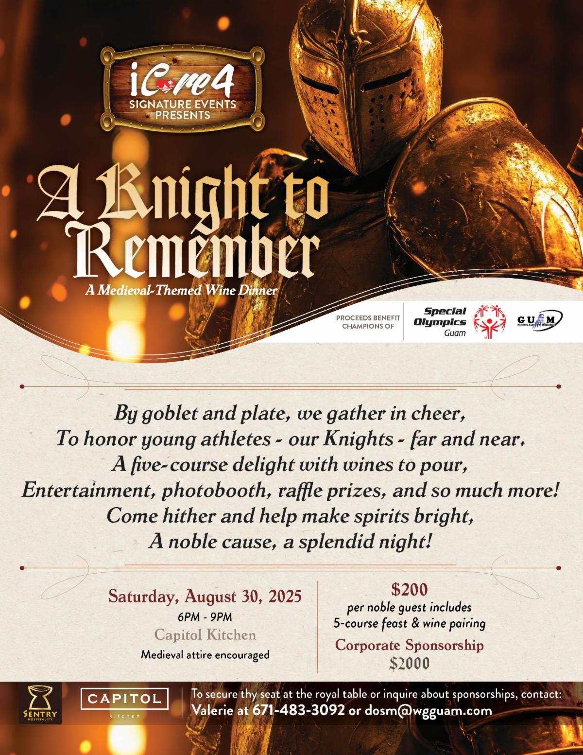 Proceeds benefit Special Olympics Guam and Guam National Badminton Federation, supporting year-round training and events that empower of all abilities to thrive. Corporate Tables available. Download the flyer for details and opportunities to participate. Medieval attire encouraged.