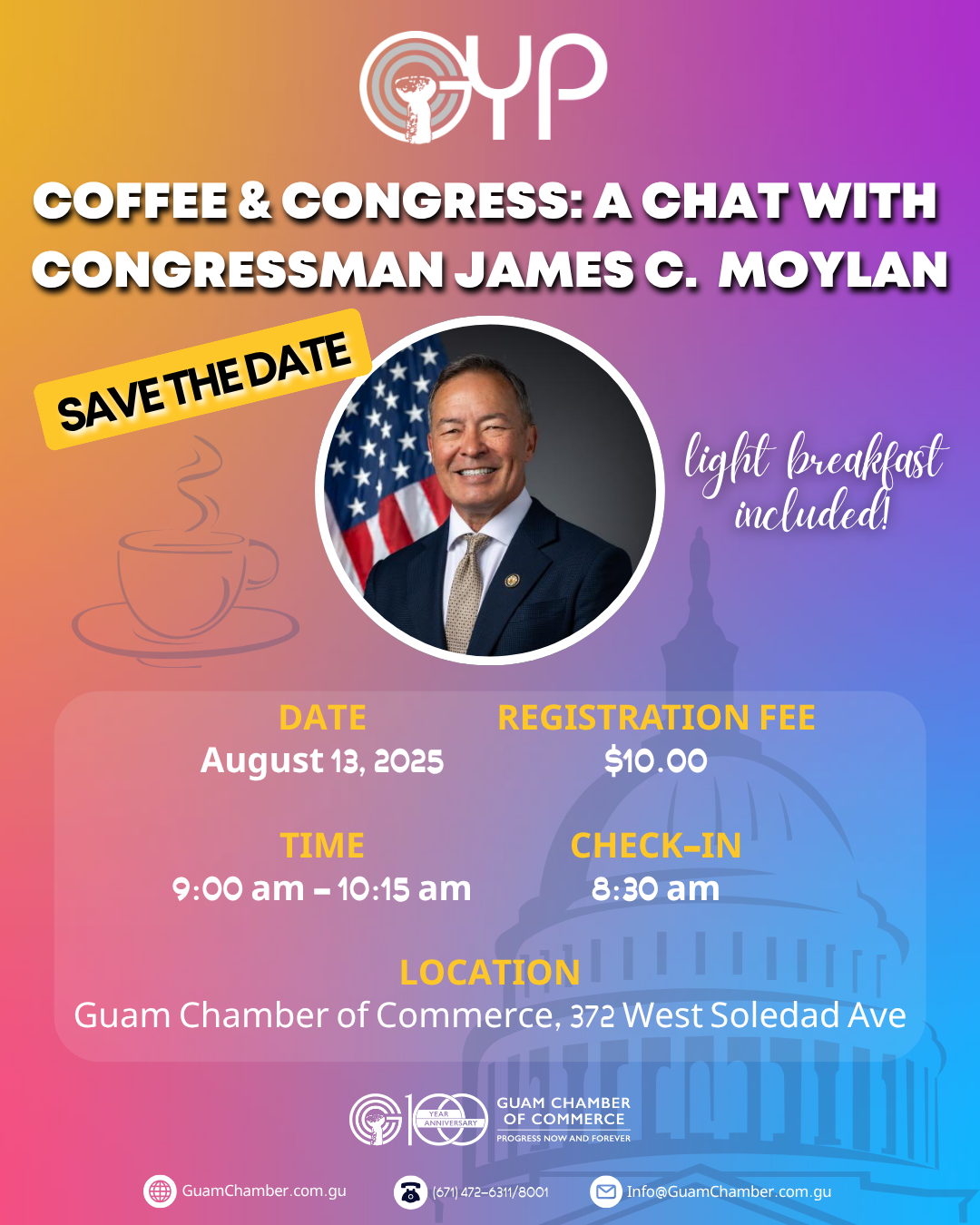 The Guam Young Professionals is excited to host Coffee & Congress: A Chat with Congressman James C. Moylan on Wednesday, August 13, 2025, from 9:00 AM to 10:30 AM at the Guam Chamber of Commerce office in Hagãtna.