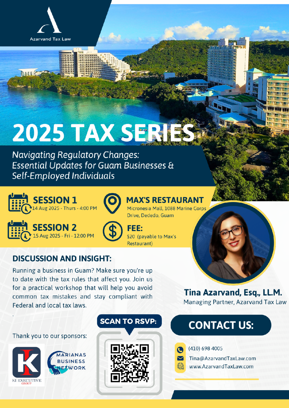 Running a business in Guam? Azarvand Tax Law is offering a practical workshop that will help you avoid common tax mistakes and stay compliant with federal and local tax laws. Scan the QR code to RSVP or email Tina@AzarvandTaxLaw.com