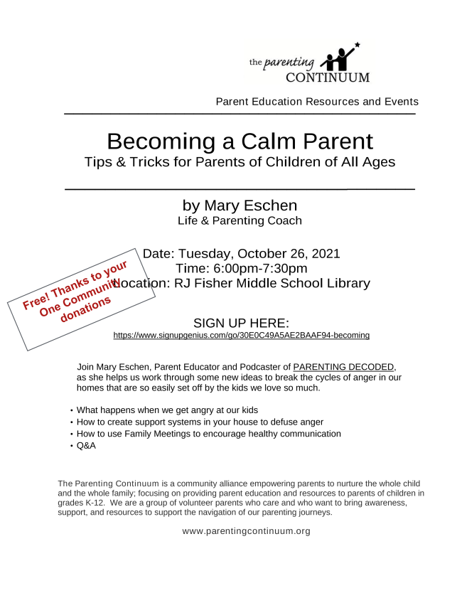 - October 26: The Parent Continuum - "Becoming a Calm Parent"