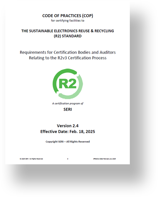 Version 2.4 of the R2 Code of Practices has been released! The COP is a normative document that governs how the R2 Certification program operates, establishing requirements for Certification Bodies (CBs) and auditors to maintain consistency, strengthen program quality, and support continuous improvement throughout the certification process. This update introduces several enhancements to strengthen the R2 Certification program, including: