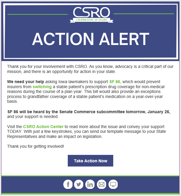 The Rheumatology Association of Iowa, as a member of the Coalition of State Rheumatology Organizations, encourages members to Make Your Voice Heard on the subject of non-medical switching by contacting your State Representatives using the template linked below. The deadline for this effort is Thursday, January 26 at 10:00am. |