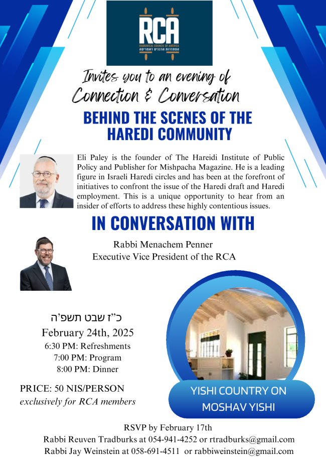 Thank you to our Chaver R. Yitzchak Blau for leading our Hebrew Chaburah. Recordings can be found here. Additionally, we are happy to announce an upcoming program on Monday night, February 24: Connection & Conversation: Behind the Scenes of the Haredi Community at the Yishi Moshav. See flyer below for more information.