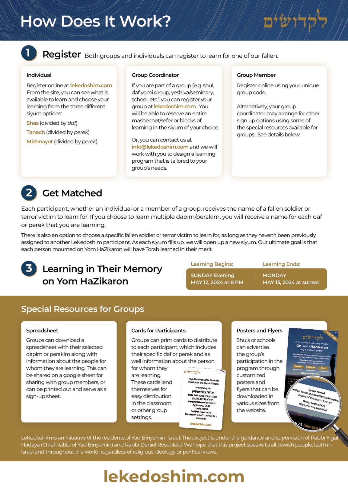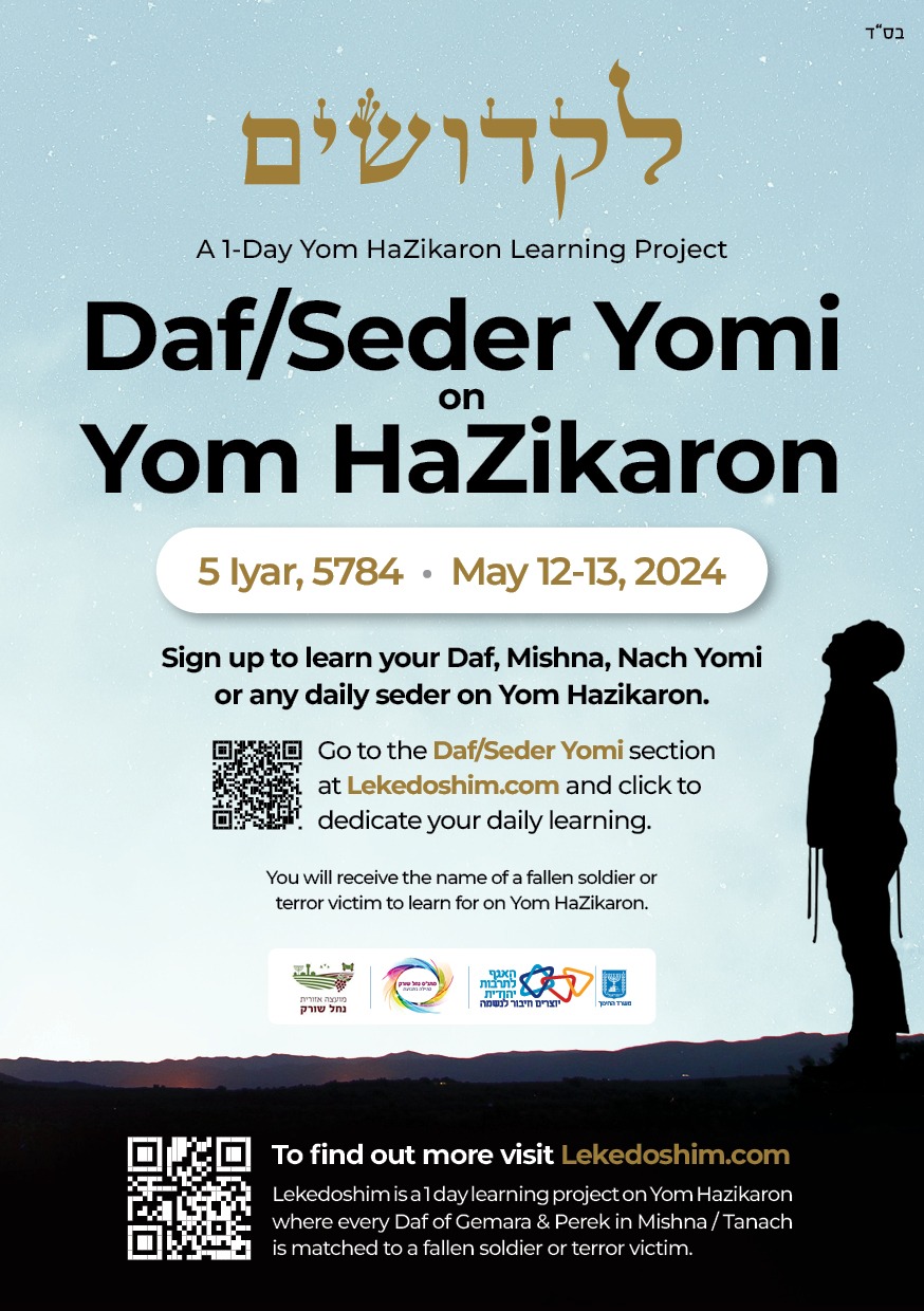 LeKedoshim: Sign up to learn your daf yomi, nach yomi, mishna yomi, or other daily learning for a fallen soldier on *Yom Hazikaron." Submit your email and a name and details of a fallen soldier will be sent to you to learn for on Yom Hazikaron, Click Here for more information.