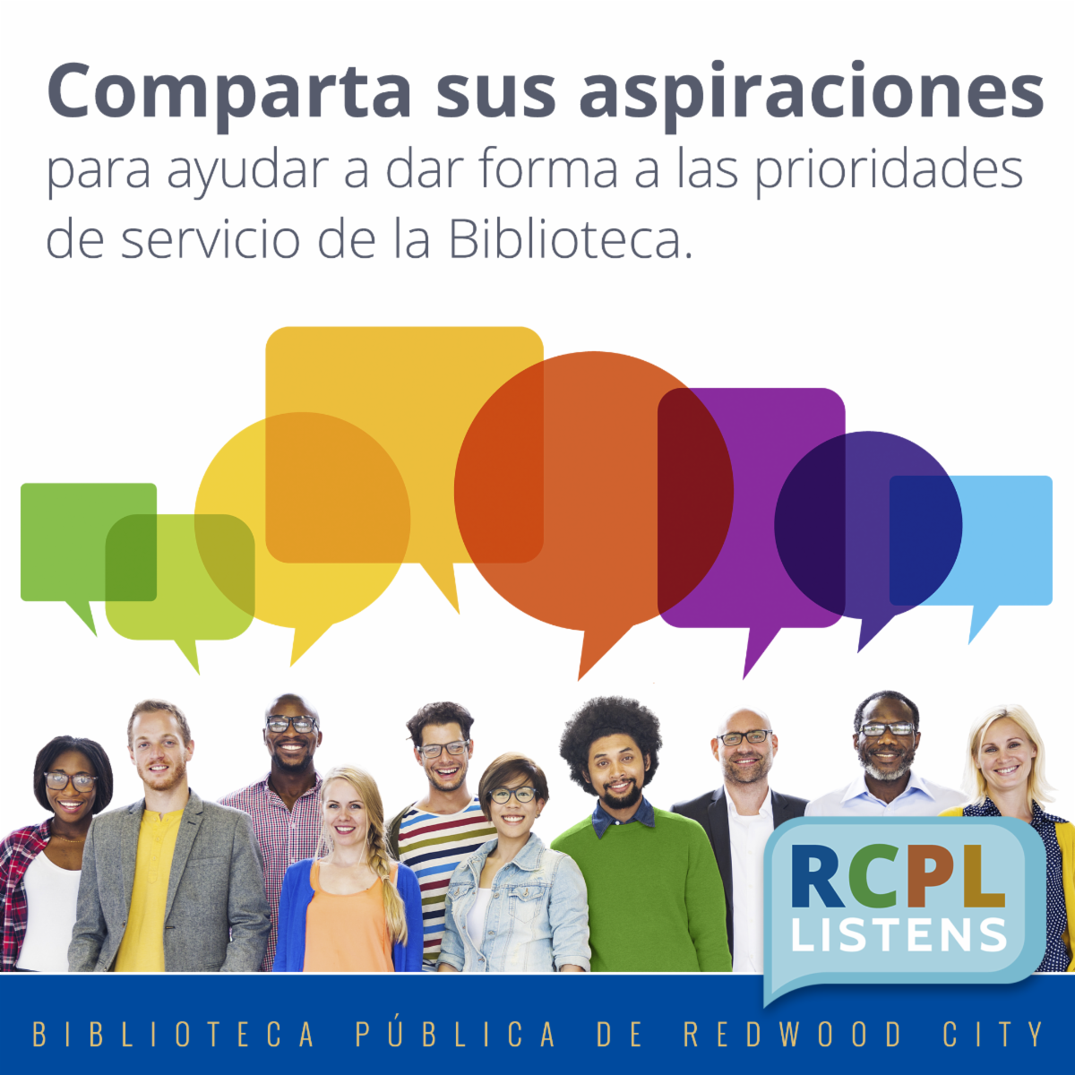 En la segunda mitad de 2016, la biblioteca llevó a cabo una serie de dieciséis diálogos comunitarios que incluyeron a más de 200 personas que representan una muestra de diversidad representativa de la gente de Redwood City y North Fair Oaks. Cinco temas comunes surgieron de estas conversaciones en forma de aspiraciones comunitarias a las que la Biblioteca podría contribuir de manera positiva. Nuestras áreas de enfoque y prioridades de servicio durante los últimos 5 años se han guiado por estas conversaciones. RCPL Listens 2022 tendrá un formato similar y dará forma a nuestras prioridades de servicio para los próximos 5 años.