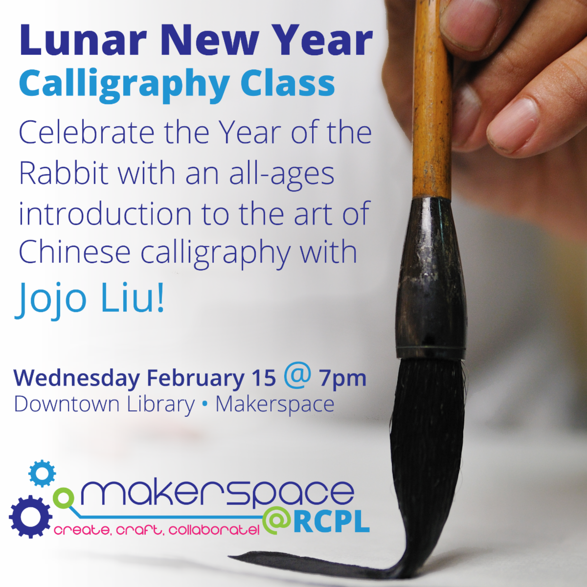 Try your hand at one of the oldest art forms in the world at our Chinese calligraphy class on Wednesday, February 15 at 7pm! This Makerspace workshop is suitable for all ages and will be taught by professional artist Jojo Liu, who has joyfully shared calligraphy with hundreds of students across the Bay Area. In this class, you'll learn and build on the basics: holding a brush, basic strokes, and writing Lunar New Year sayings. What better way to ring in the Year of the Rabbit? More details here