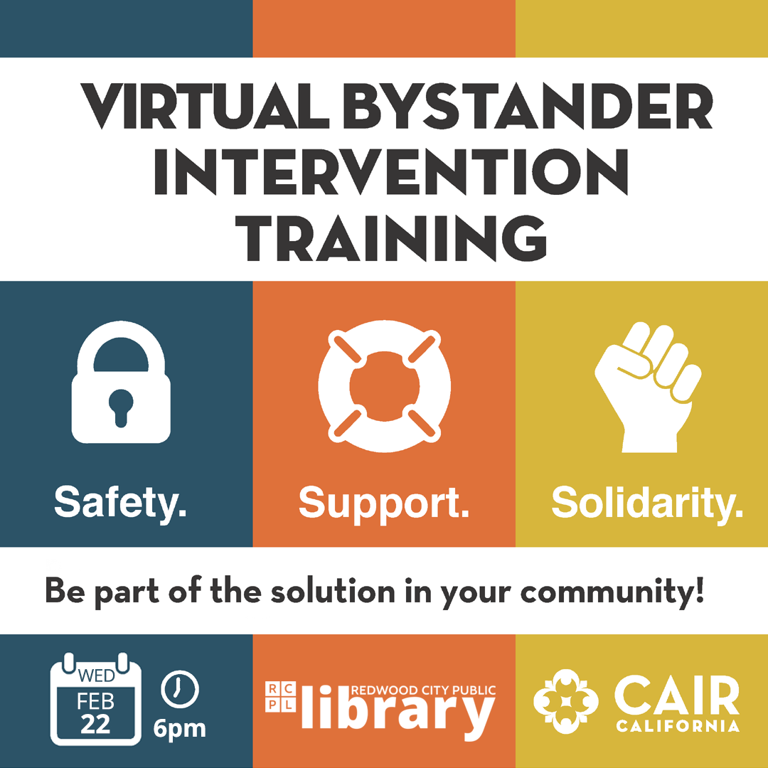 As a part of advocating for justice and mutual understanding, Council on American-Islamic Relations-SF Bay Area (CAIR-SFBA) and the library are offering an online Bystander Intervention Training on February 22 at 6pm. Many allies ask how they can help de-escalate incidents of verbal harassment. Learn how to de-escalate a hate crime or hate incident and how to provide safety, support and solidarity to the person being targeted. To register for this event, go here.