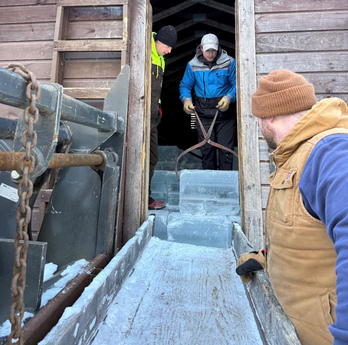 Thanks to their hard work, both icehouses are now filled to the brim with freshly harvested ice - around 3,000 ice cakes - for the summer ahead. The Rock ice house holds eight layers, while the Deep ice house holds nine. Each ice block measures approximately 15.5" x 19.5" x ice depth; this year, the ice reached an impressive 16 inches by Sunday, with blocks weighing around 154 pounds each.