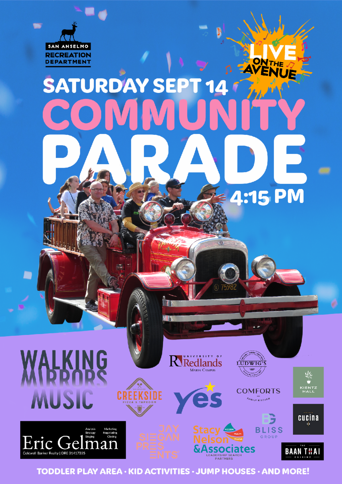 Live On The Avenue continues through the end of September with FREE live music at both Creek Park Amphitheater and Town Hall Plaza, plus downtown party and the popular mid-avenue "Kid Zone." Great music this weekend, and movies, music, and town parade next weekend... totally free through the ongoing sponsorships by Creekside Pizza & Taproom, Eric Gelman at Coldwell Banker, Walking Mirrors Music, and other fine local merchants. restaurants, and community members. Avenue "KidsZone" presented by Harvest Wealth Management and Wink Optics. Northern California's longest-running free live music festival is here in San Anselmo, Live On The Avenue! Next family movie night on September 13th. Parade at 4pm on the 14th, and Wonderbread 5 headlines closing night party on September 28th