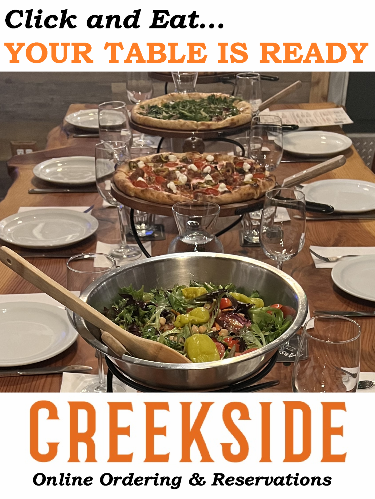 CLICK & EAT: Creekside opens daily at 11AM, 365 days a year. Lunch, takeout, dine in. Friday and Saturday nights fill up Fast! To book your next lunch, dinner, or party reservation for your awesome Creekside Experience, CLICK HERE