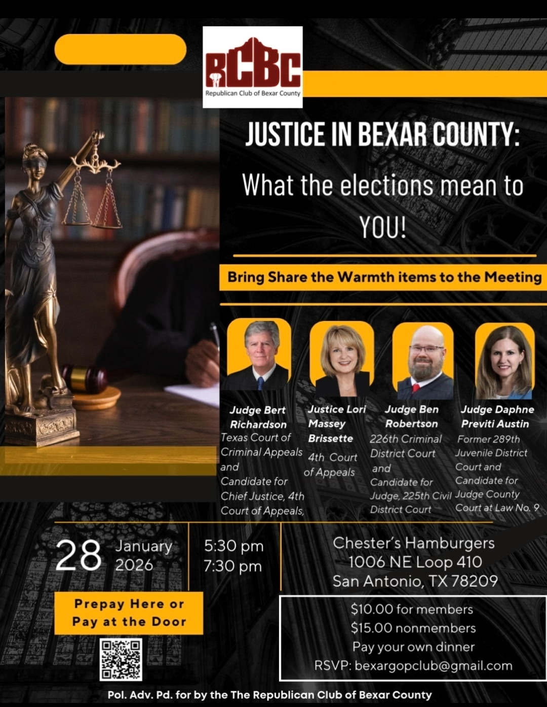 + Other organizations are holding forums for federal and state candidates, but we shall concentrate on the Judicial Branch this month. Come meet the candidates for judges and learn from the panelists about their duties, trivia, and the court system in Texas.