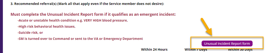 Primary Form (DD3024, DD2900): Provider recommended a referral for Mental Health Specialty Care within 24 Hours. Provider identified areas of concern to be Physical Health, Mental Health Symptoms, PTSD Symptoms, Depression Symptoms and Risk of Self-Harm. Provider indicated in the Comments section that the SM was an intermediate risk for self-harm.