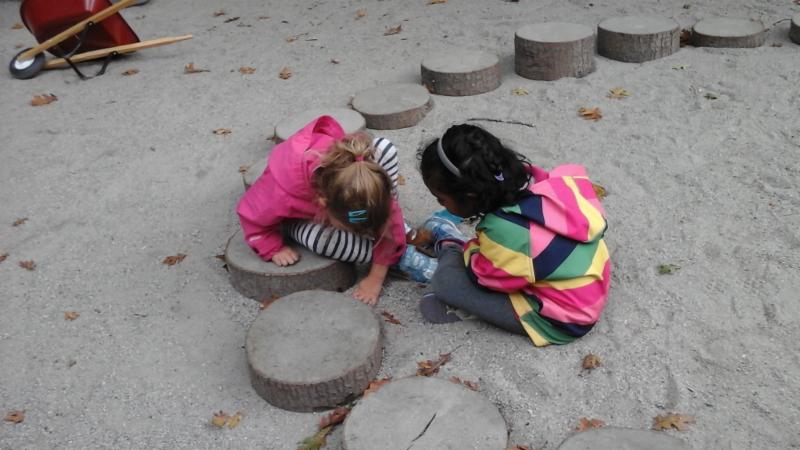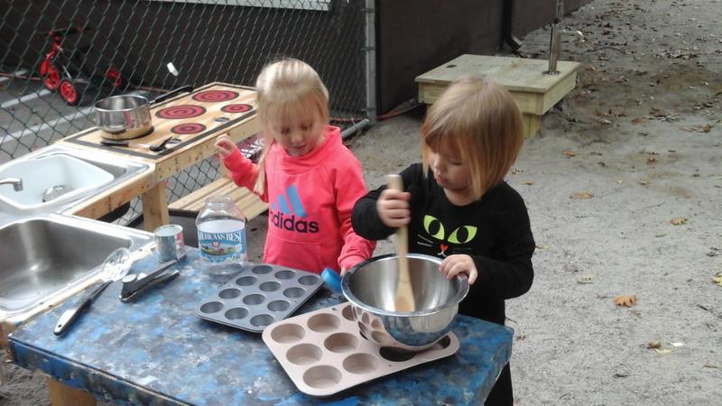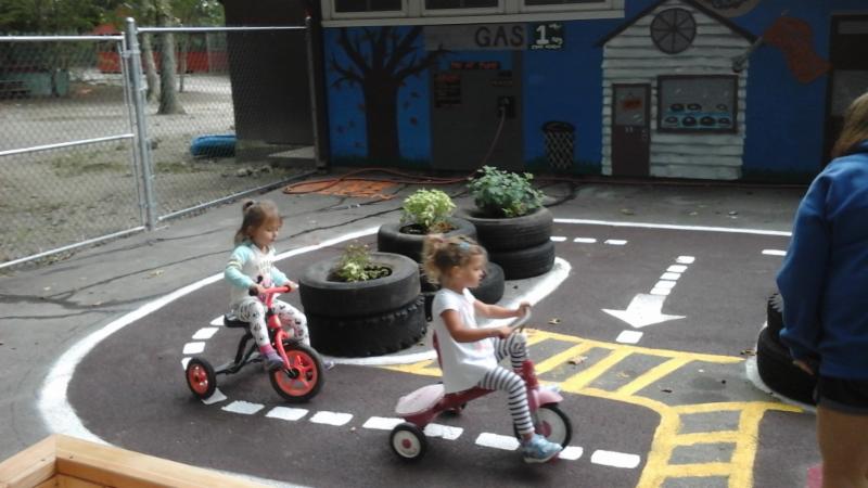 Changes made at this site included removing an extensive amount of tree roots to prepare the site for new grass, painting a trike track on an asphalt pathway, adding painted chalkboard art panels to the building exterior, creating music panels from stockade fence and donated kitchen tools, building a mud kitchen, weeding and planting garden beds, and installing a new stone dust trike track.