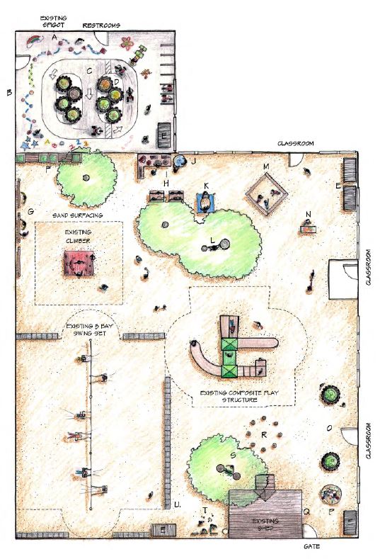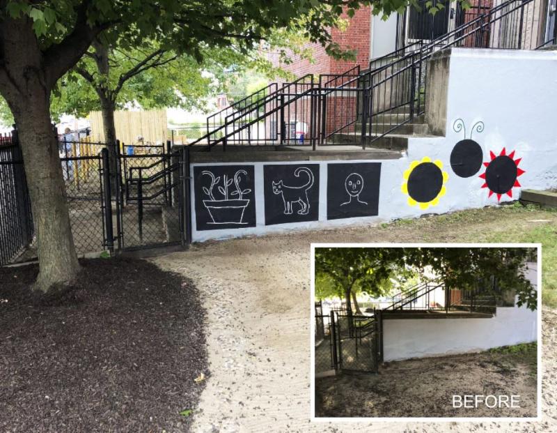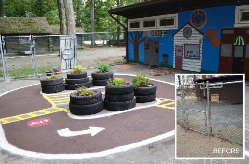 Changes made at this site included painting a trike track (with trike parking and tire planters) in a newly fenced portion of the playground, installing a water pump and mud kitchen, creating music panels, re-purposing tires for vibrant fairy gardens, constructing a "construction" zone, building two planter benches for rest and reflection, and painting new wall murals, chalkboard panels, and a shed in need of some TLC to name a few!