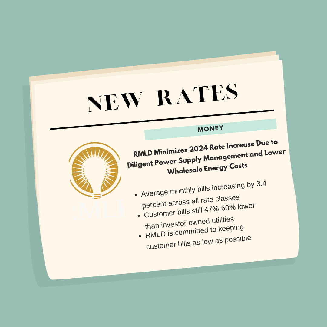 Due to diligent power supply management and lower wholesale energy costs, RMLD has minimized its rate increase for 2024. Average monthly bills will increase by 3.4 percent across all rate classes effective March 1, 2024. As an example, the average residential bill is forecasted to increase by $3.65, which also incorporates a $0.69 increase to retire certificates to adhere to decarbonization compliance mandates. (More on that below!)
