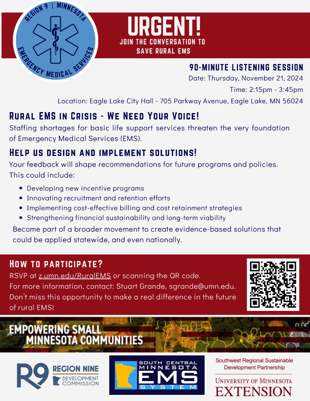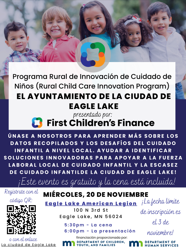 Calling all Eagle Lake residents! The city is holding a town hall event to lead discussions on child care and the Rural Child Care Innovation Program. You can register by scanning the QR code or clicking the button below. | |