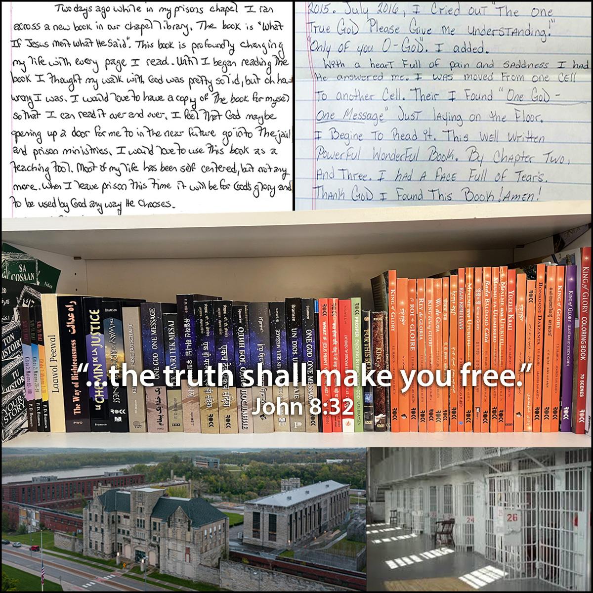 • Baltimore Prison (2016): “A week ago, I was a Muslim. I, with the help of you and the Holy Spirit, found understanding in the Holy Bible. I cried out to the One True God, “Please give me understanding!” And I added, “Only of You O GOD!” With a heart full of pain and sadness, He answered me. I was moved to another cell. There I found the book One God One Message just lying on the floor. I began to read... By chapters two and three, I had a face full of tears. Thank God I found this book! Amen! ... Jesus Christ set me free!” To the praise of His glory,