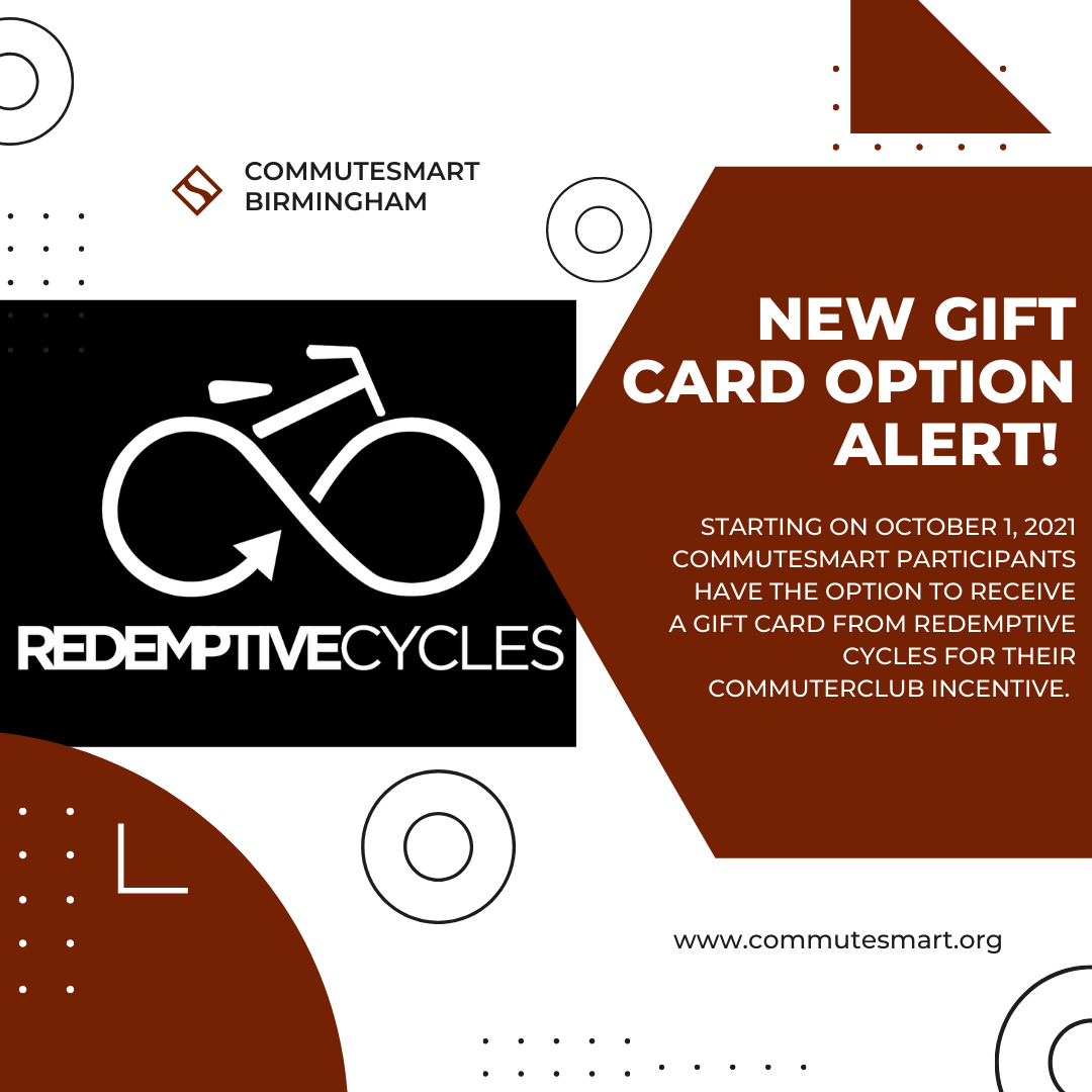 CommuteSmart is excited to launch their latest gift card offering for Commuters! Starting October 1, 2021 Commuters can choose the option of getting a $25.00 gift card from Redemptive Cycles for their CommuterClub incentive! CommuteSmart is always looking for additional incentives to offer our participants.