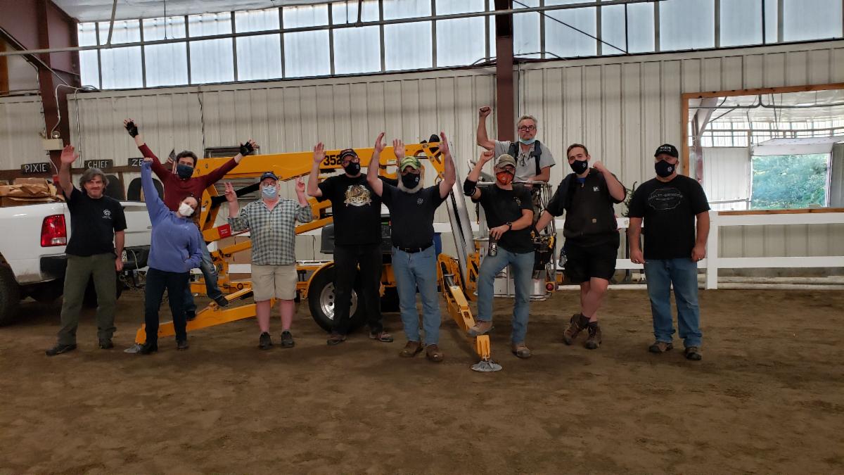 A huge shout out to volunteers from the IATSE Local 114 (International Alliance of Theatrical Stage Employees) for their donation of time and talent in September installing new arena LIGHTS!! For those of you who have been in the arena on cloudy, overcast days, or late in the day this fall, we know you have welcomed "the light!" Special thanks also to Groom Energy who arranged for replacement of half of the lights and Energy Management Consultants who arranged for replacement of the other half. Collectively this was a HUGE gift to RTT--and more importantly to our clients, volunteers and horses who can now see! The members of IATSE #114 were incredible in operating a boom lift up and around so much of our ceiling fixtures (gas lines, sprinklers, etc) and you can see them here jumping for joy when the project was finished. Thank you one and all!!